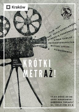 Serdecznie zapraszamy na pokaz filmu krótkometrażowego „Kot” w reżyserii Zofii Kowalewskiej, po którym odbędzie się dyskusja prowadzona przez psychoterapeutkę Kingę Gawlas oraz filmoznawcę Michała Lesiaka.